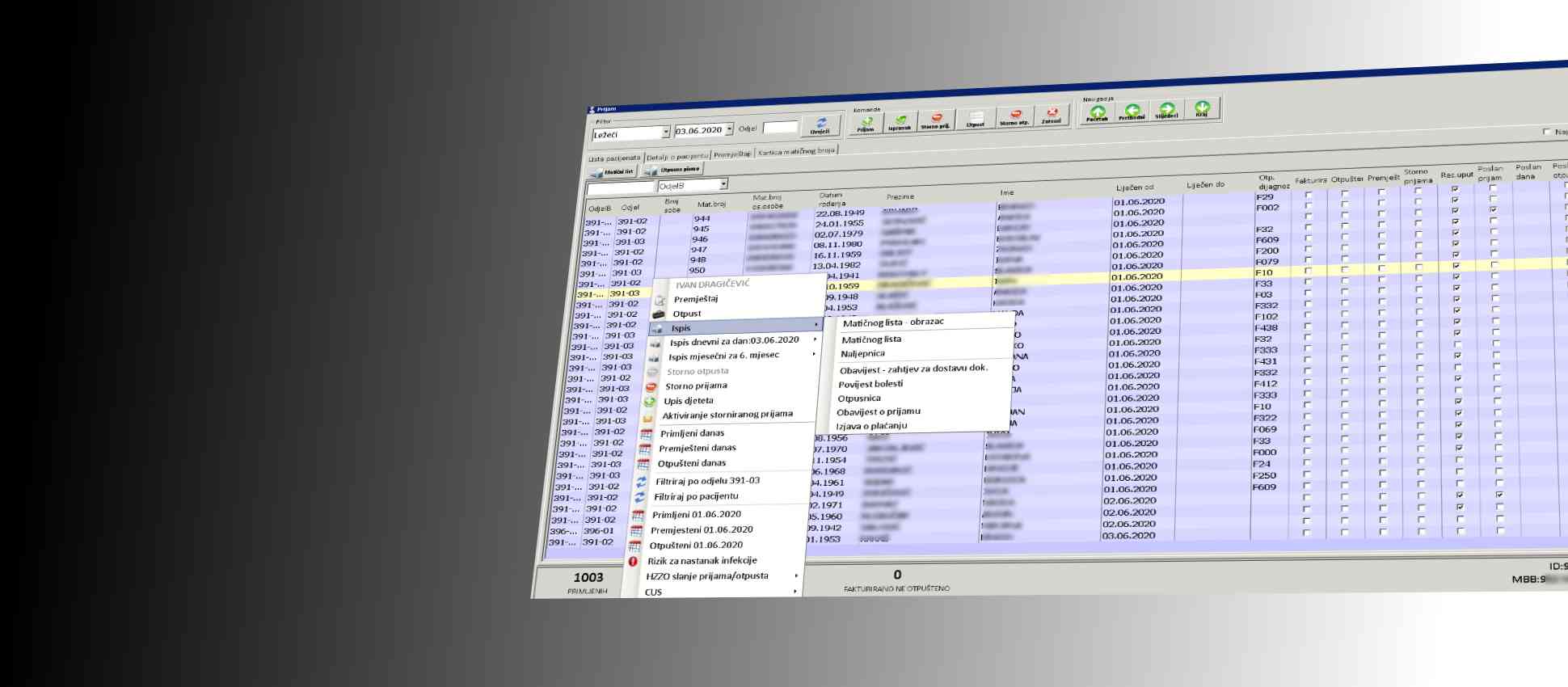 Obrada pacijenata u stacionarnom liječenju i specijalističko-konzilijarnoj zdravstvenoj zaštiti, izrada računa i ostale dokumentacije potrebne za naplatu troškova liječenja od HZZO-a, praćenje pacijenta od ulaska do izlaska iz bolnice, informacije o popunjenosti i statusu bolesnika u stvarnom vremenu. Poslovanje ambulante u specijalističko-konzilijarnoj zdravstvenoj zaštiti pokriva cjelokupni tok rada od rasporeda rada po odjelima, doktorima i ambulantama preko narudžbi pacijenata i čekaonice u ambulanti do obrade pacijenta i stvaranja digitalnog bolesničkog kartona.