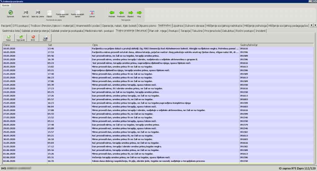 Integralni dio modula stacionara. Pacijentu se bilježe svi sestrinski postupci i dane terapije koje su zadane specifikacijom sestrinske dokumentacije.