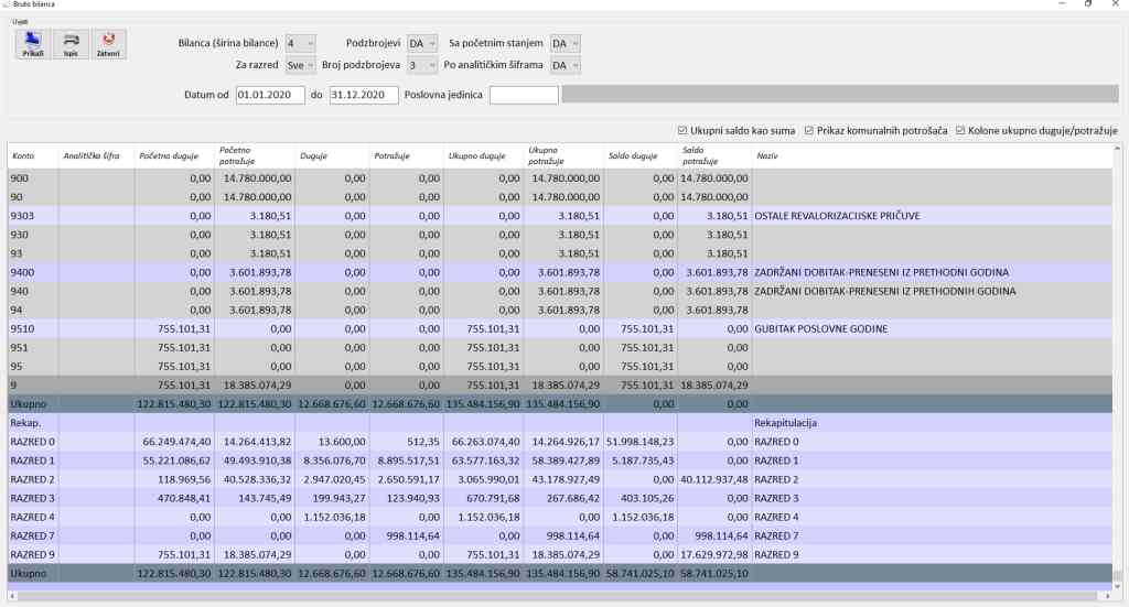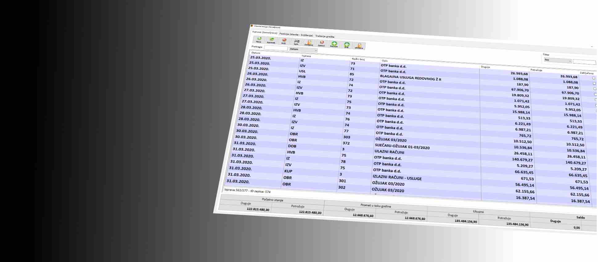 Glavna knjiga, knjige ulaznih i izlaznih računa (URA, IRA, obračun i prijava PDV-a, R1 i R2 računi), salda-konti. Potpuna integracija sa komunalnim modulom, automatsko i poluautomatsko knjiženje zaduženja iz komunalnog modula i uplata iz glavne knjige u komunalne salda-konte te blagajne u glavnu knjigu. Financijska izvješća, salda-konti izvješća, bruto-bilance, definiranje bilanci i podbilanci.