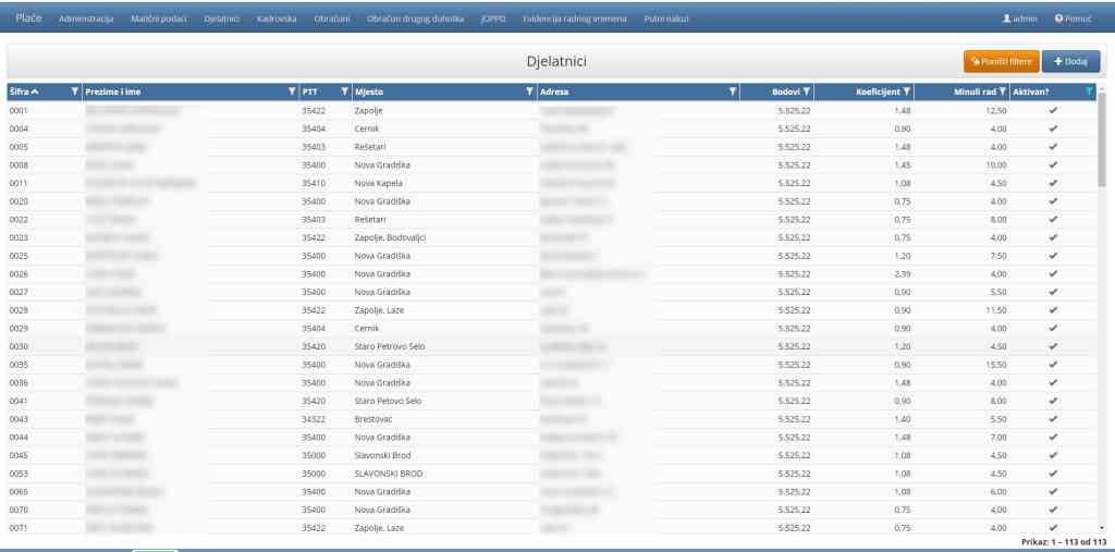 Evidencija djelatnika sa svim podacima potrebnim za obračun plaće.